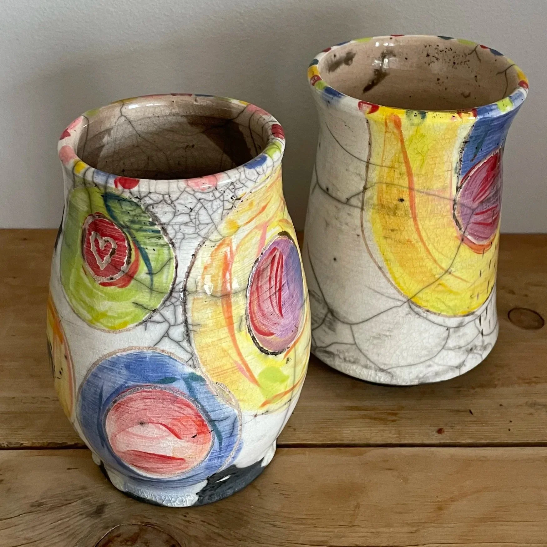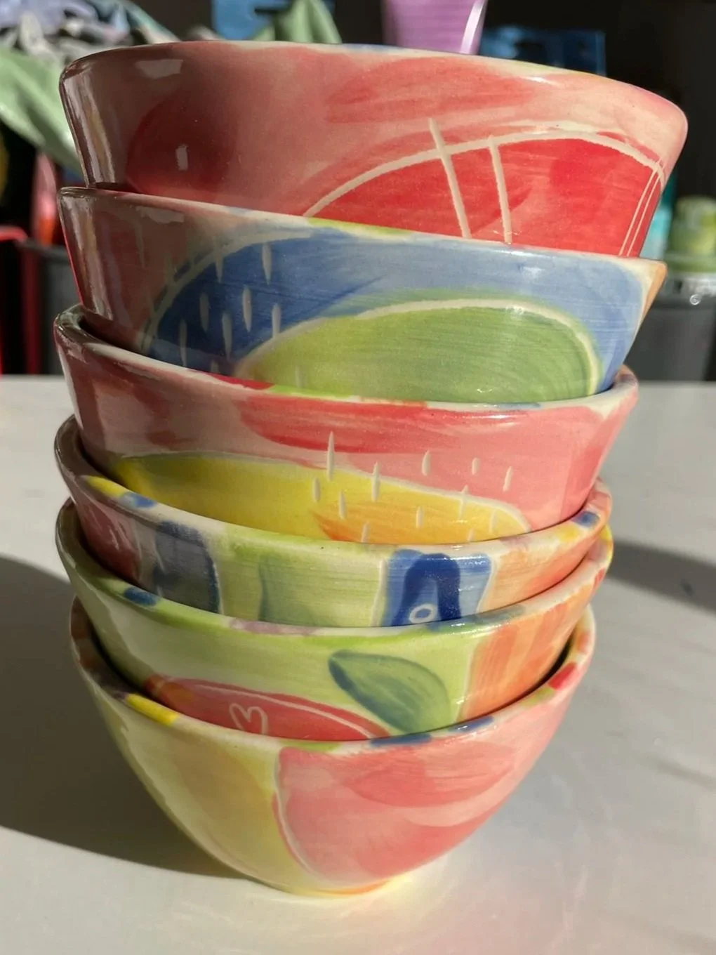 Known for my bright, joyful use of colour, my work is inspired by the natural beauty of gardens, skies, and coastal landscapes, translated into intuitive, freeform patterns. I paint on multiple surfaces at once, in a free-form intuitive abstract style. I work in both ceramics and visual arts, always in bright cheery colours.